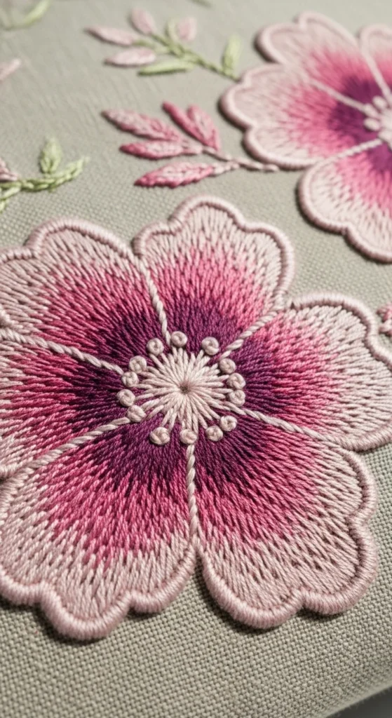 Gradient floral embroidery gives petals a soft shaded look that feels richer than flat color. This idea works especially well for roses, peonies, cosmos, and soft wildflowers because the color can move from dark at the center to lighter near the edges. You do not need many shades to make this work. Even three thread tones in one family can create a lovely ombre effect. A smart budget trick is to buy only a dark, medium, and light version of the same color instead of a full palette. Start with one flower head before turning the design into a bouquet. That keeps the stitching manageable and lets you focus on how the shades meet. Try using shorter stitches near the center and slightly longer ones as the color opens outward. This can make the petal transitions feel softer. Gradient florals are beautiful on cushion corners, framed hoops, and decorative linen panels because the shading catches the eye right away. The final result feels delicate and elevated, but the process stays realistic for a home project if you keep the first flower small and let the color do the work.