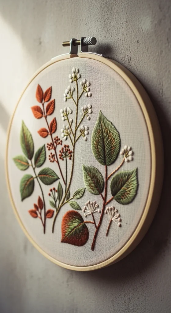 Botanical embroidery inspired by pressed plant studies looks wonderful as wall decor. Instead of a lush bouquet, this idea focuses on one stem, one herb sprig, or a few carefully stitched leaves with a more realistic layout. Think of it like a stitched herbarium page. This style works especially well in hoops or narrow framed panels because the design feels organized and airy. Choose one botanical subject, such as lavender, eucalyptus, fern, or chamomile, and let the stem shape stay slender. If you are working on a budget, use natural-toned fabric and only a few thread colors so the project feels clean rather than overloaded. A nice tip is to add a tiny stitched label line or monogram beneath the stem if you want the piece to feel more curated. This kind of embroidery looks especially pretty in kitchens, hallways, and bedrooms where soft botanical decor suits the room. It brings a classic handmade feel without becoming fussy. If you enjoy floral embroidery but want something a little more restrained and grown-up, a herbarium-style hanging is a very elegant direction to take.