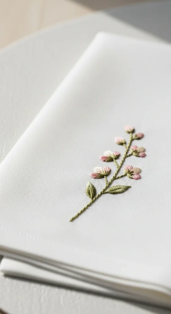 A placed single flower can look more elegant than a crowded bouquet. That is the beauty of spotlight stem embroidery. Instead of filling the full fabric, stitch one flower exactly where it will be noticed most, such as a napkin corner, pillow edge, pouch flap, or table runner end. This makes the placement feel intentional and polished. A single stem with two leaves and a bloom is often enough. You can choose a rosebud, tulip, daisy, poppy, or any soft botanical shape that suits your decor. A low-cost benefit of this style is that it uses very little thread and works well on fabric scraps or older linens you want to update. If you are new to floral embroidery, this is an ideal way to practice because the scale stays small and the pressure stays low. You are not committing to a giant full-piece design. Spotlight stems are especially useful for gifts because they make ordinary household items look personalized and handmade. This pattern idea proves that one well-placed flower can do more than a large design placed without thought.