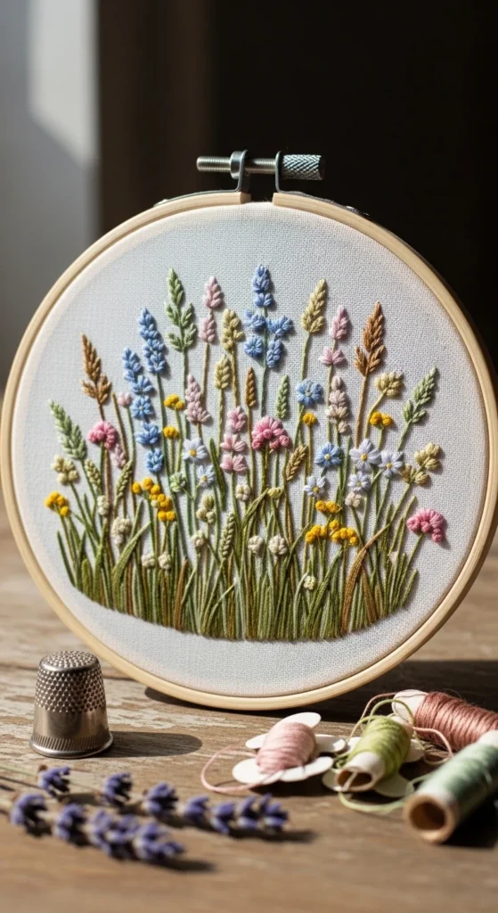 Wildflower meadow embroidery feels soft, airy, and very charming in home decor. Instead of one formal flower, this pattern uses many smaller blooms, grass sprigs, tiny buds, and leaf stems grouped in a loose field-like arrangement. It works especially well in hoops because the rounded frame naturally suits a scattered bouquet. If you want to keep it affordable, use a few repeated flower shapes rather than designing ten different blooms. Tiny daisies, knots for buds, and slim grass lines can create a convincing meadow effect with just a handful of stitches. This style looks beautiful in pastel palettes, but it also works in earthy greens, faded golds, and muted pinks for a more rustic finish. A useful tip is to vary the flower height so the arrangement feels natural. Do not line everything up evenly. Wildflower bouquets are lovely for nursery walls, entryway decor, and seasonal spring displays. They feel light and joyful without looking formal. If you like floral embroidery that feels organic and relaxed rather than symmetrical, this is one of the prettiest ways to fill a hoop or small framed panel.