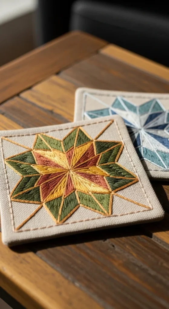 Geometric floral embroidery is a great option when you want flower-inspired decor that feels modern. Instead of soft rounded petals, this style uses cleaner angles, repeated shapes, and structured lines to suggest blossoms in a more graphic way. It works especially well on small decor items like fabric coasters because the compact format suits crisp patterns. Try one flower built from triangles, diamonds, or faceted petal sections in just two or three colors. This keeps the design clear and affordable. You do not need a huge palette to make the shape look striking. A nice way to keep costs low is to stitch onto sturdy scrap fabric backed with felt or old denim, then cut the coaster shape afterward. These floral coasters look elegant on coffee tables, side tables, or gifting trays because they feel decorative without being overly sweet. If your home decor leans a little more minimal or contemporary, this pattern style fits in beautifully. It still counts as floral embroidery, but the mood is sharper, cleaner, and more design-led than traditional roses or trailing vines.