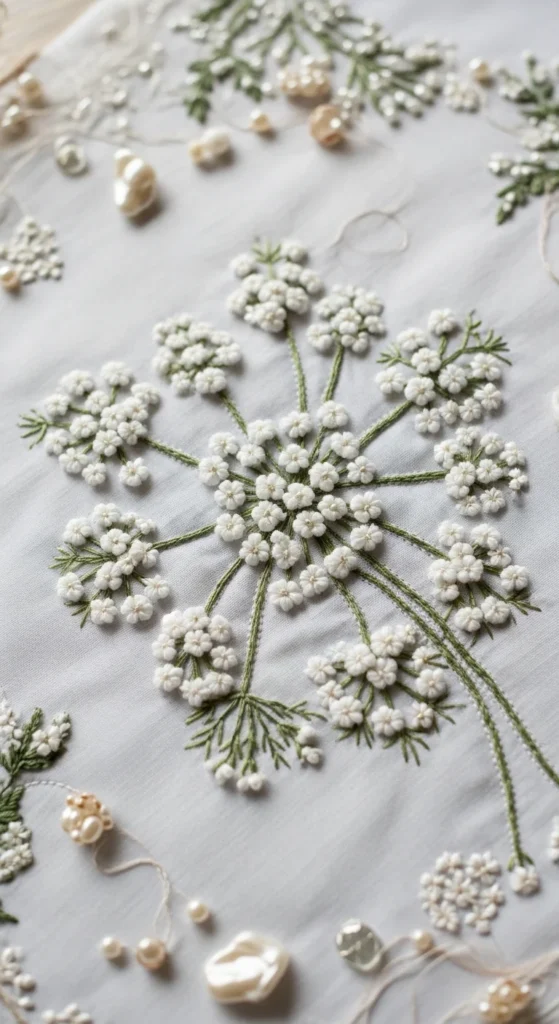 Padded floral embroidery can make delicate flower heads look soft and sculptural. A Queen Anne’s lace-inspired pattern works especially well because the design already has a clustered shape that looks beautiful when given gentle lift. Instead of padding every section, focus on one or two main bloom heads and let the stems and leaves stay flatter. This keeps the piece elegant rather than bulky. A small framed hoop or a decorative fabric panel is a good place to try this style first. If you want to keep costs down, use small thread scraps or thin fabric bits under the raised sections rather than buying specialty padding materials. The goal is not extreme height. Even a subtle lift can make the floral pattern look richer. Soft neutrals, pale sage, ivory, or faded blue threads work beautifully for this style because they let the texture show without shouting. This type of embroidery feels especially refined on bedroom decor, nursery walls, and quiet seasonal displays. It is a lovely option if you want something romantic and tactile but still very soft in mood.