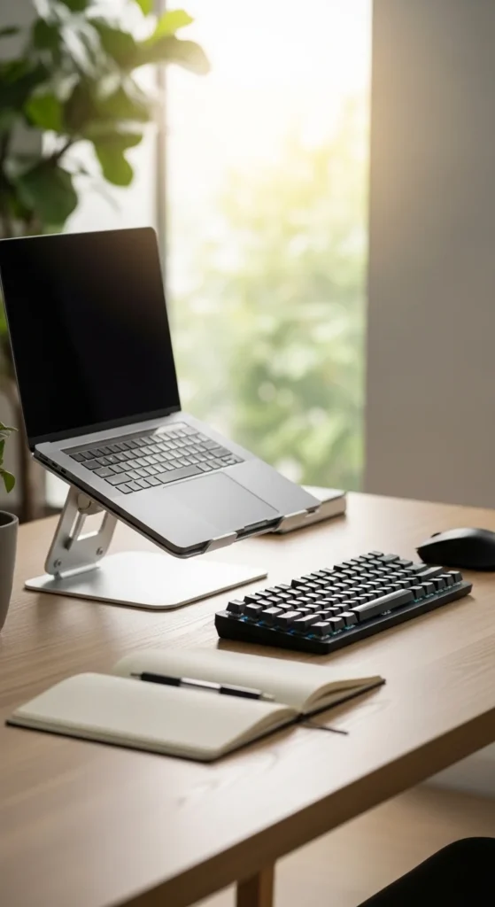 A laptop stand paired with an external keyboard is one of the most practical home office upgrades because it improves posture while also making the desk look more structured. When a laptop sits flat on the desk, the screen often feels too low and the whole setup can look compressed. Raising the laptop gives the workspace more layers and opens up space underneath for slim storage or simply more visual breathing room. An external keyboard lets you keep your hands at a more comfortable level while the screen stays easier to see. This arrangement works especially well in smaller home offices where one laptop serves as the main work device. If you are on a budget, a stack of sturdy books or a simple wooden riser can work as the stand until you want a dedicated one. Try to keep the keyboard and mouse in tones that match the rest of the setup. A laptop stand changes the overall shape of the desk in a good way. It makes the screen feel more intentional, the work area feel more open, and the daily experience feel more comfortable over long hours of work.