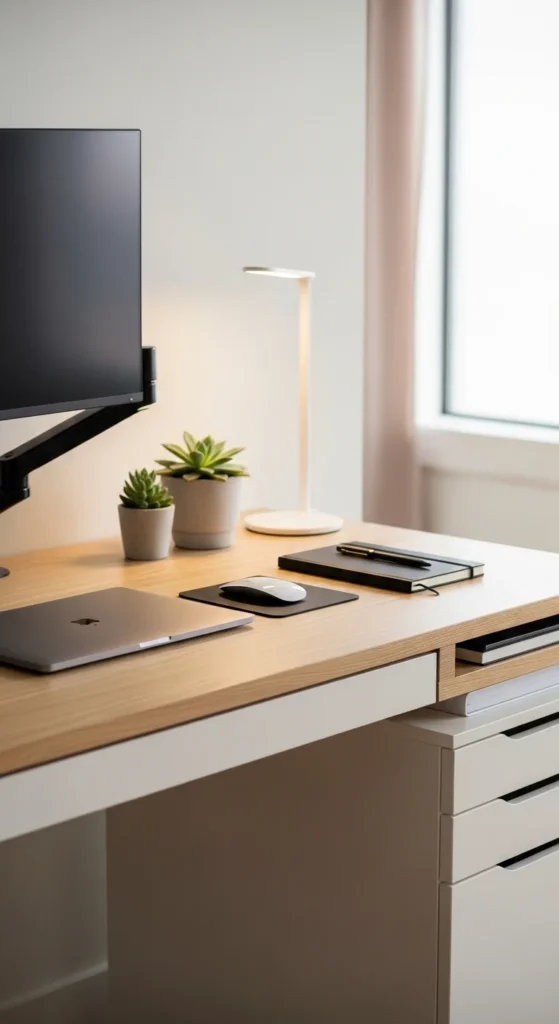 A dedicated writing zone is a helpful desk idea for people who still use notebooks, planners, or handwritten notes alongside digital work. Instead of letting paper float wherever it lands, create one clear section of the desk for writing. This might be a left-side notebook area with a pen tray and coaster, or a central space kept open by moving the keyboard slightly when needed. This setup is useful because it respects the reality of work at home. Many tasks still require quick notes, lists, sketching, or planning on paper, and when the desk has no room for that, everything starts piling up. A writing zone keeps the desk more functional and also more attractive because the surface has a clear rhythm. The screen area, the writing area, and the storage area each have their own place. If you are working with a smaller desk, even using a slim riser or tray can help create more space for writing below or beside the monitor. This small layout choice can make the home office feel more natural to use and much less frustrating throughout the day.