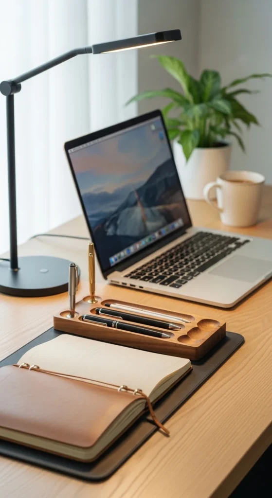 A warm desk lamp can change the feeling of a home office far more than most people expect. Many rooms rely on harsh ceiling lights, which can make the desk feel flat and tiring, especially at night. A small lamp with a warm bulb creates a softer, more focused pool of light that makes the work area feel separate from the rest of the room. This is especially useful if your home office is in a bedroom or living area where you want a more relaxed mood after dark. A warm lamp also gives the desk more depth and can make wood, paper, and neutral accessories look richer and more inviting. If you are working with a smaller budget, even a basic lamp from a thrift store can look beautiful with the right bulb and placement. Put it on the side opposite your writing hand if you use notebooks often, and keep the shape simple if the rest of the desk already has many items. A warm lamp is both practical and decorative. It helps with visibility, supports a calmer atmosphere, and makes the desk feel more like a place you want to sit down and use.
