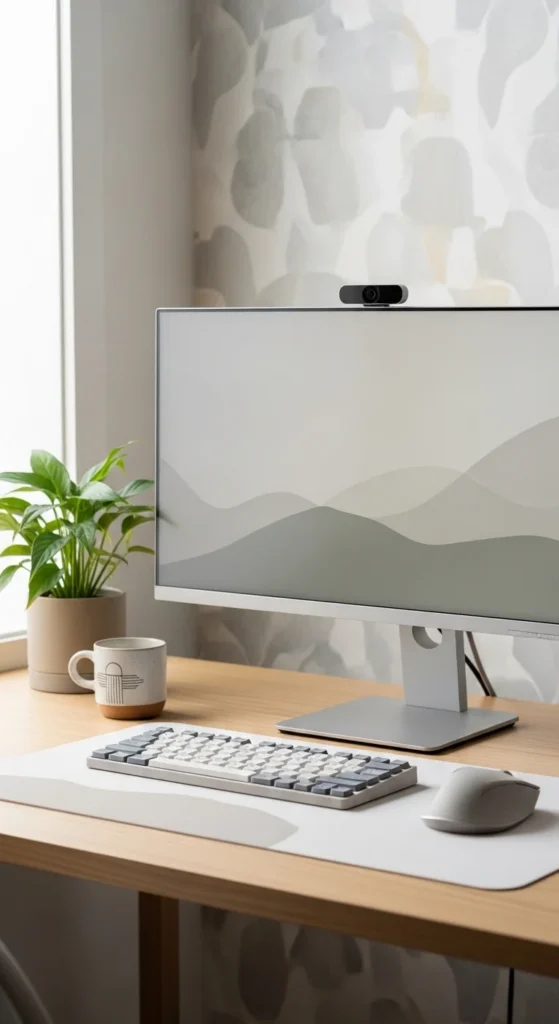 A matching color palette across your main desk tools can make the whole setup feel more thoughtful without needing a major redesign. The monitor, keyboard, and mouse are the pieces your eyes land on most often, so when they work well together, the desk instantly looks calmer. White, cream, black, grey, soft green, and muted pink are popular choices, but the real goal is simply to avoid a setup where every main tool feels unrelated. If you already own different colors, you can still bring them together with a desk mat, monitor riser, or tray in one steady tone that acts like a visual base. This idea works especially well in home offices because it helps the desk look polished on camera and more peaceful in daily use. You do not have to replace everything at once either. Sometimes one updated keyboard or mouse is enough to make the setup feel more aligned. The less visual noise you have around your main work tools, the easier the desk often feels to settle into. A matching palette does not just make things look better. It also makes the work area feel more deliberate and easier to maintain.