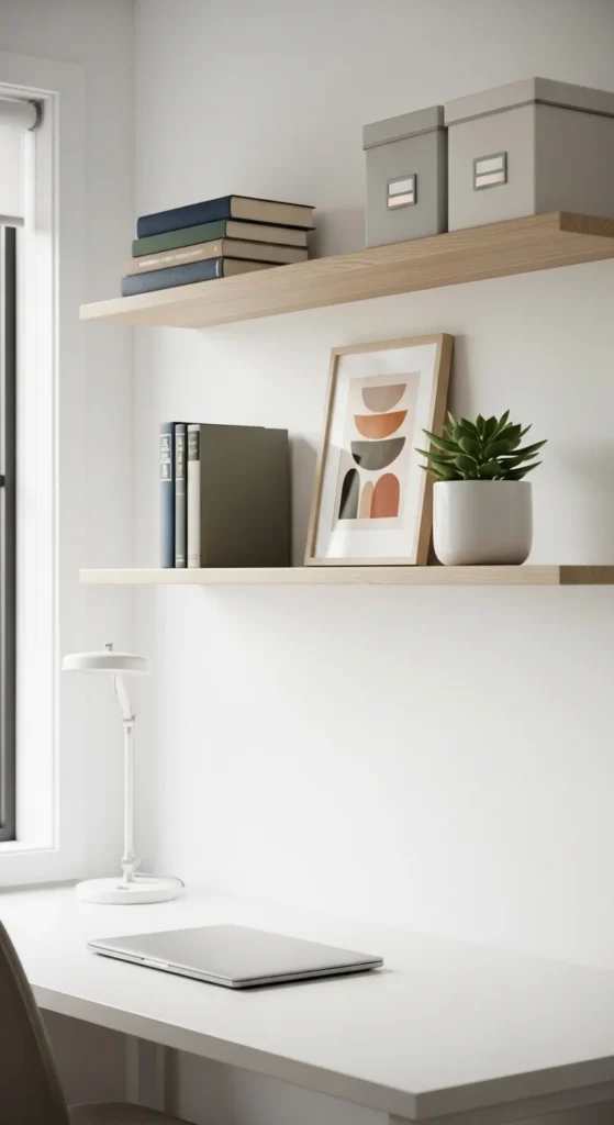 A floating shelf above the desk can make a home office feel layered and finished, but the key is to keep the styling edited. One shelf with books, a small plant, one framed print, and a tidy storage box usually looks much stronger than a crowded shelf stuffed with random items. This kind of shelf is helpful because it adds vertical storage without shrinking the desk surface. It can hold notebooks, spare chargers, paper supplies, or decorative objects that would otherwise take over the workspace. A wood shelf adds warmth, while a white shelf keeps things bright and minimal. If you want a low-cost version, a plain board with simple brackets can work beautifully once painted or lightly sanded. The floating shelf is especially good for home offices in bedrooms or shared spaces because it helps visually define the desk area. It also gives you a place to display one or two personal touches without cluttering the actual work zone. When styled lightly, a shelf makes the desk look more established and pulled together, which can help the whole room feel more professional and more pleasant to work in.