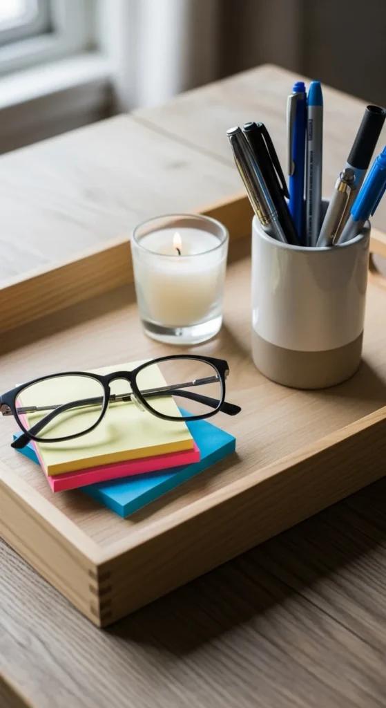 One desk tray can do a lot to make a home office feel more orderly because it gathers the little items that usually spread out and create visual mess. Pens, sticky notes, glasses, lip balm, earbuds, clips, and other everyday tools can live in one defined space instead of floating around the desk. This makes the setup look cleaner even when the tray itself holds several things. It also makes the desk easier to reset at the end of the day. Trays work especially well in home offices because daily life often brings extra objects to the desk that would not appear in a formal office. A simple tray helps that mix of work and life feel more managed. Wood, ceramic, metal, woven, or acrylic trays can all look good depending on your style. If you want a budget-friendly option, a shallow kitchen tray, thrifted plate, or sturdy box lid can work beautifully. Keep the tray edited so it does not become a clutter zone. A pen cup, one small dish, and one or two frequently used items are often enough. This single detail can make the desk feel much more thoughtful and usable.