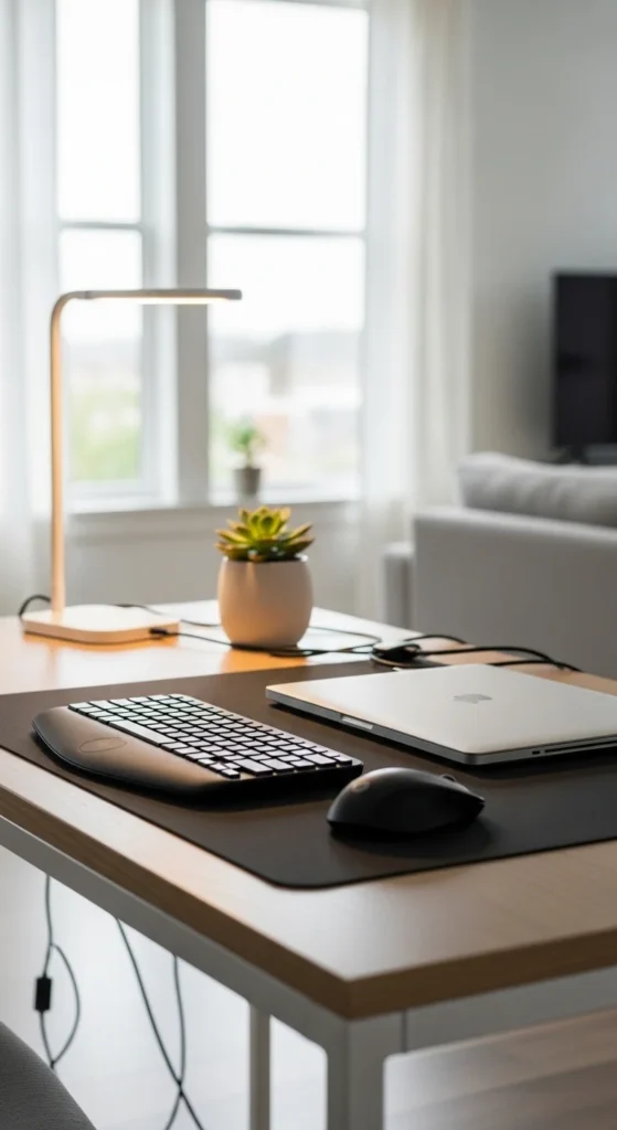 A slim desk mat can make a home office look more polished almost immediately because it creates a clear visual zone for the main work tools. Instead of letting the keyboard, mouse, notebook, and everyday items float on the desk, the mat groups them together into one neat area. This makes the setup feel more intentional and much less scattered. A soft desk mat in taupe, beige, charcoal, sage, or muted brown can also help tie different desk accessories together, especially if your keyboard, mouse, and storage pieces are in similar tones. Beyond looks, it protects the desk surface from scratches, mug rings, and pen marks, which is useful if you work on a wood or painted table. If you are on a budget, you do not need an expensive leather version. Felt mats, cork mats, or even a neatly cut fabric layer can work surprisingly well. This setup detail is particularly effective for home offices because it helps the desk feel like a real work zone rather than just another table in the house. A good mat adds softness, order, and a cleaner overall shape to the desk without taking up any extra room.