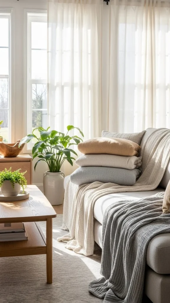 For warmer months, keep lighter throws and breathable fabrics on display. In cooler months, swap in thicker textures. This small seasonal change keeps your home feeling comfortable year-round without a full makeover.