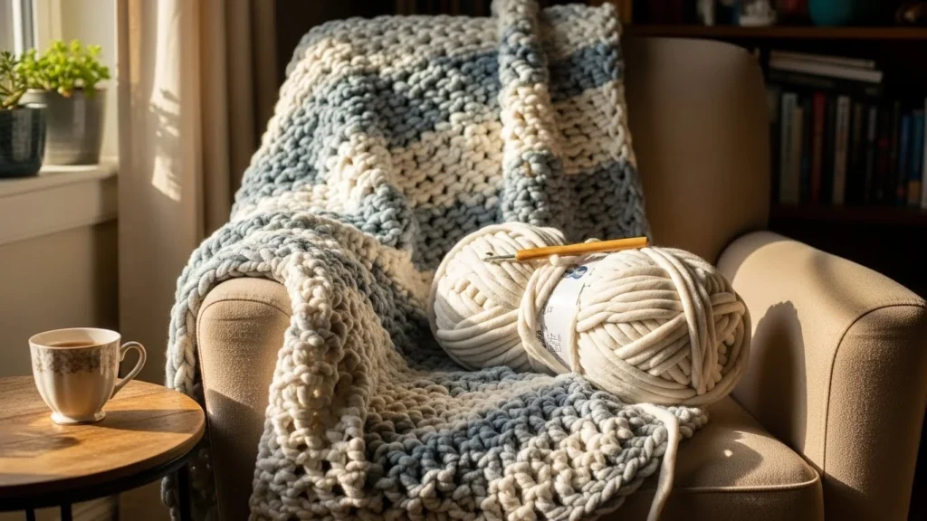 [Image Prompt] A comfy armchair with a partially completed chunky crochet blanket draped over it, a skein of yarn and crochet hook resting nearby in natural sunlight.