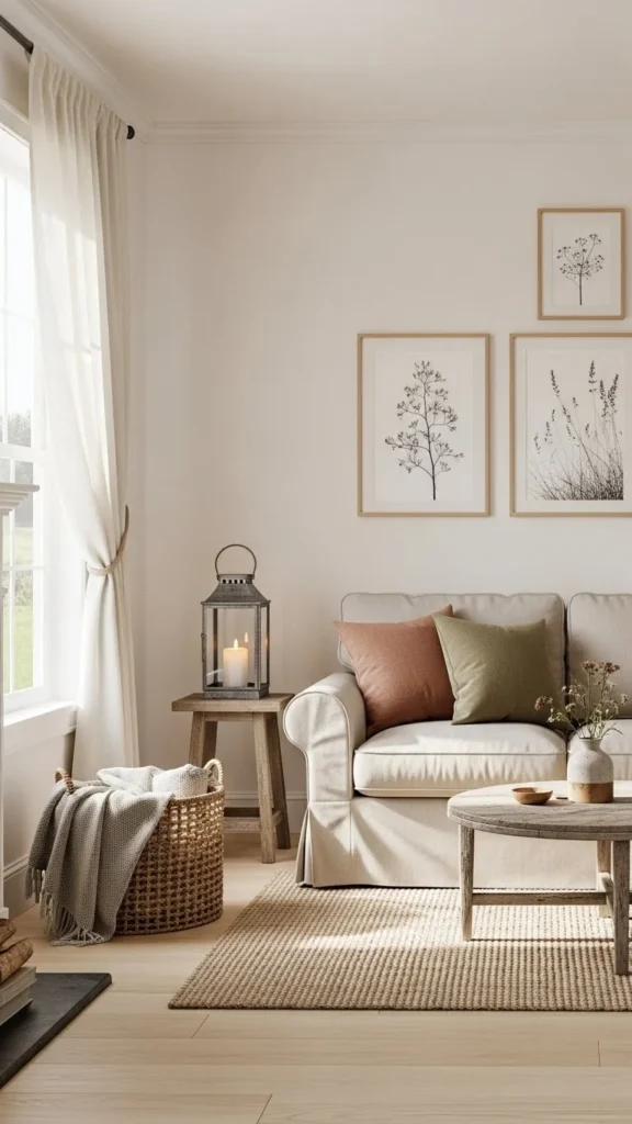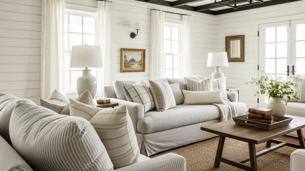 Every successful farmhouse home begins with a calm, neutral base. This keeps the space light, airy, and timeless and prevents it from feeling heavy or overly rustic.
