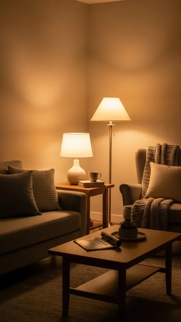 Use warm bulbs, not cool white. Lighting should feel inviting, not clinical.