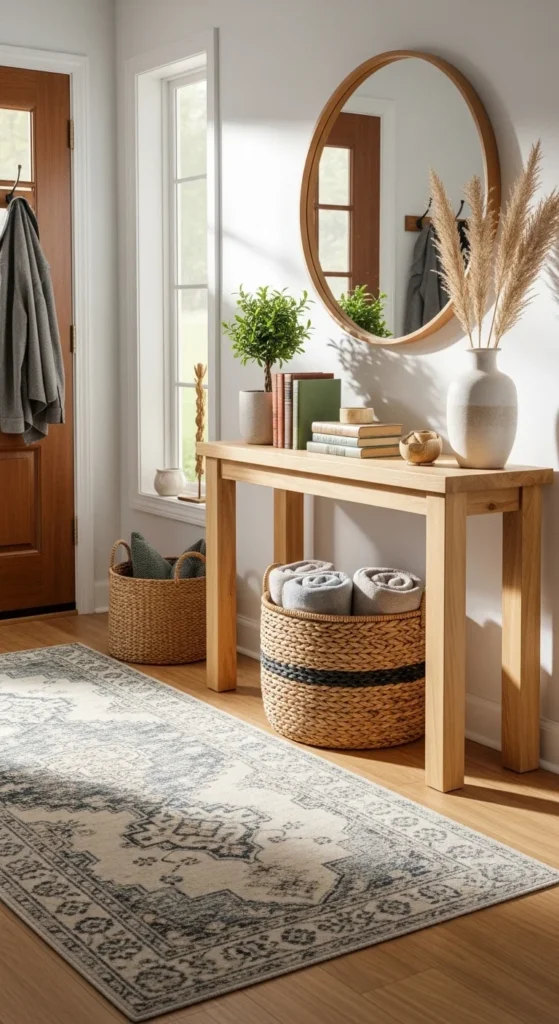 Entryways often have hard surfaces like tile floors and painted walls. Adding texture helps the space feel cozy and welcoming instead of cold. Soft and natural materials instantly warm things up.
