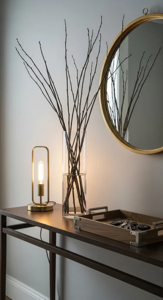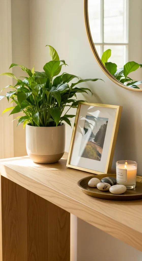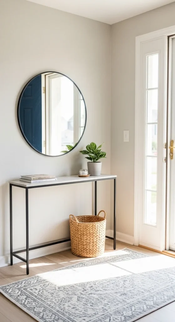 A mirror is one of the most useful and stylish additions you can make. It reflects light, makes small spaces feel larger, and gives you a quick check before heading out the door. More importantly, it creates a focal point that anchors the whole setup.
