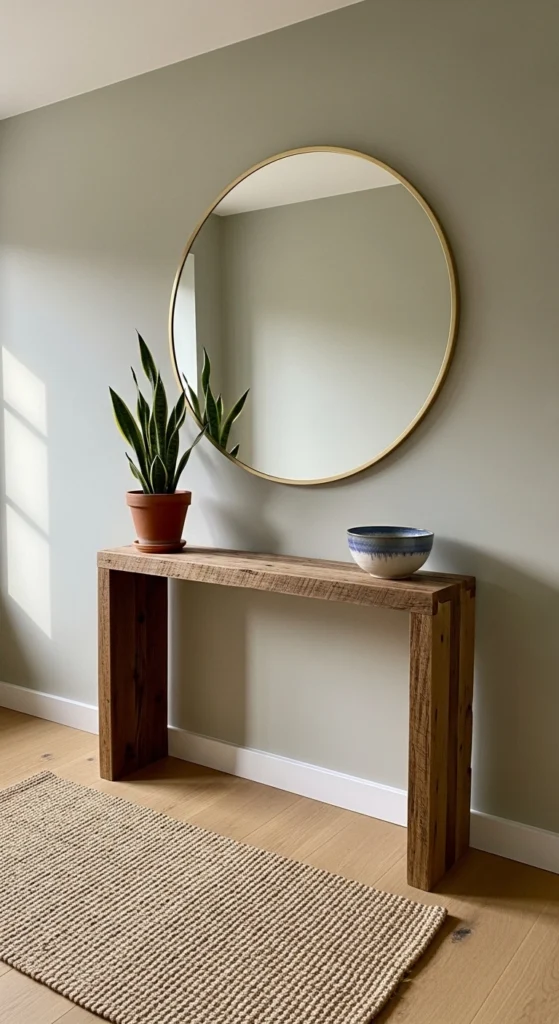 - A slim console table or floating shelf for keys and mail