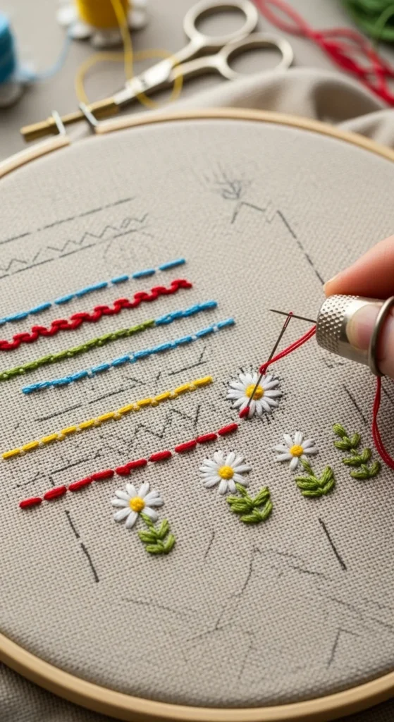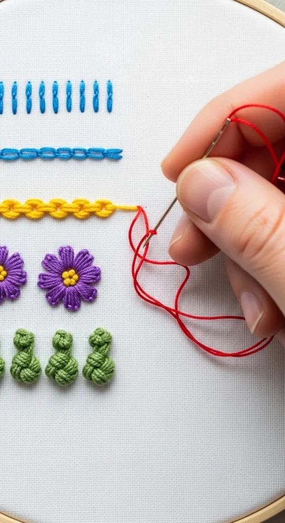 These beginner stitches are the foundation of embroidery. Practice each one on a scrap of fabric until they feel natural.