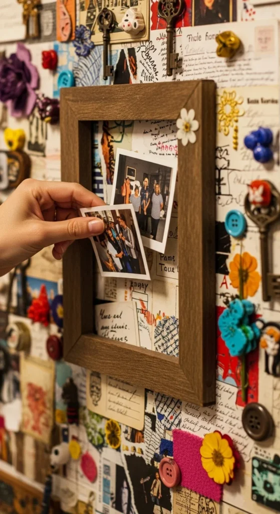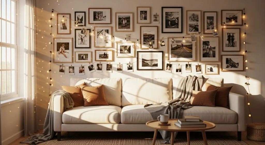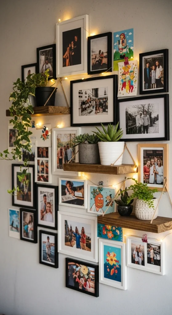 A great collage wall isn’t just about photos—it’s about creating a mood. Small decorative touches can elevate the wall from simple to stunning.
