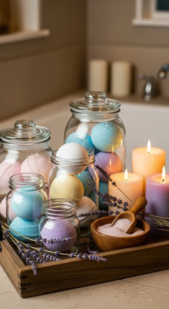 - Add botanicals: Dried lavender, rose petals, or chamomile look beautiful—but use sparingly so they don’t clog drains.