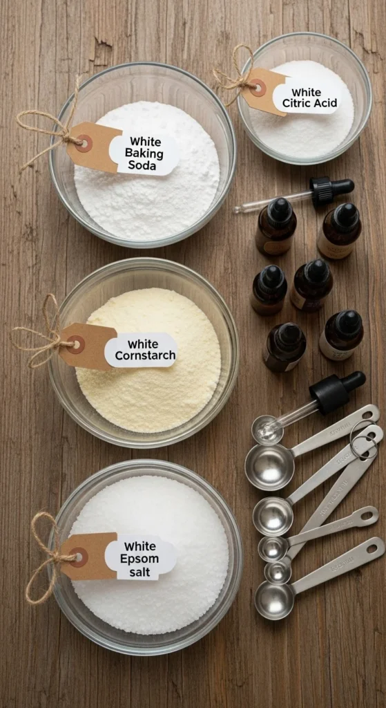 - Citric acid (½ cup): reacts with baking soda to create bubbles.