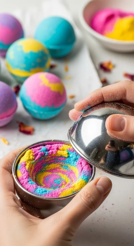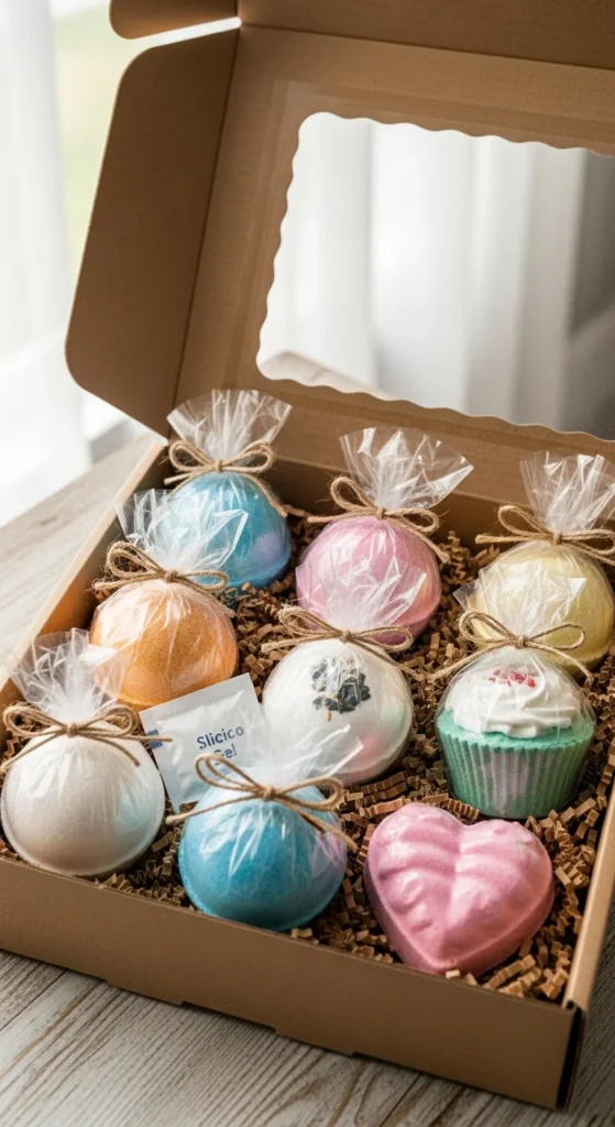For gifts, wrap each bomb in colorful tissue paper or shrink film and tie with jute string. Add a small tag that lists the scent—like “Lemon Glow” or “Lavender Calm.”