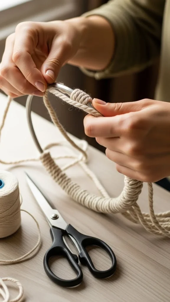 Start by wrapping your hoop completely with yarn or lace. This step gives your dream catcher a clean, polished look and helps your knots stay in place.