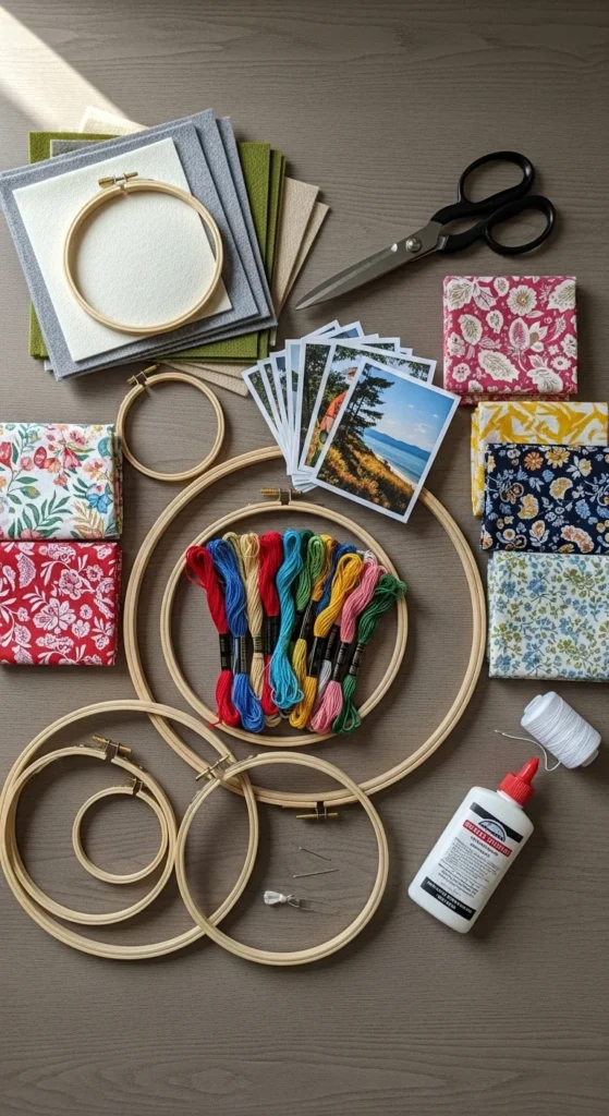- Wooden embroidery hoops (4–10 inches)