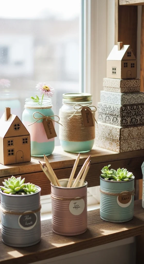 You can turn them into all kinds of quick crafts. Wrap a jar in twine for rustic storage. Cover a small box with pretty paper for a desk organizer. Cut fabric scraps into bows or mini decorations. Even a plain tin can can become a cute holder for pens or paintbrushes with a little paint or paper wrapping.