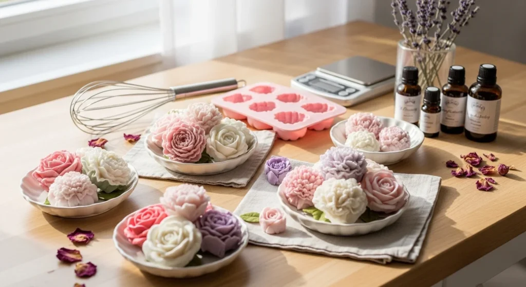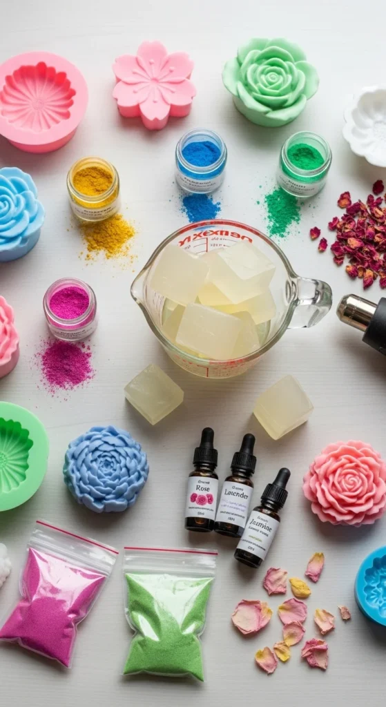 A melt-and-pour soap base is the easiest option for beginners. It saves time and keeps the project simple. Clear soap base gives a glossy look, while white soap base creates a softer, creamier floral style.