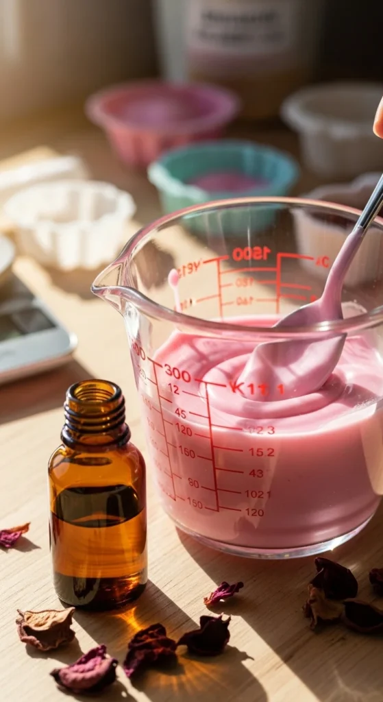Once smooth, add your fragrance oil and colorant. Start with a small amount, then adjust slowly. A little goes a long way, especially with strong fragrance oils and mica powders.