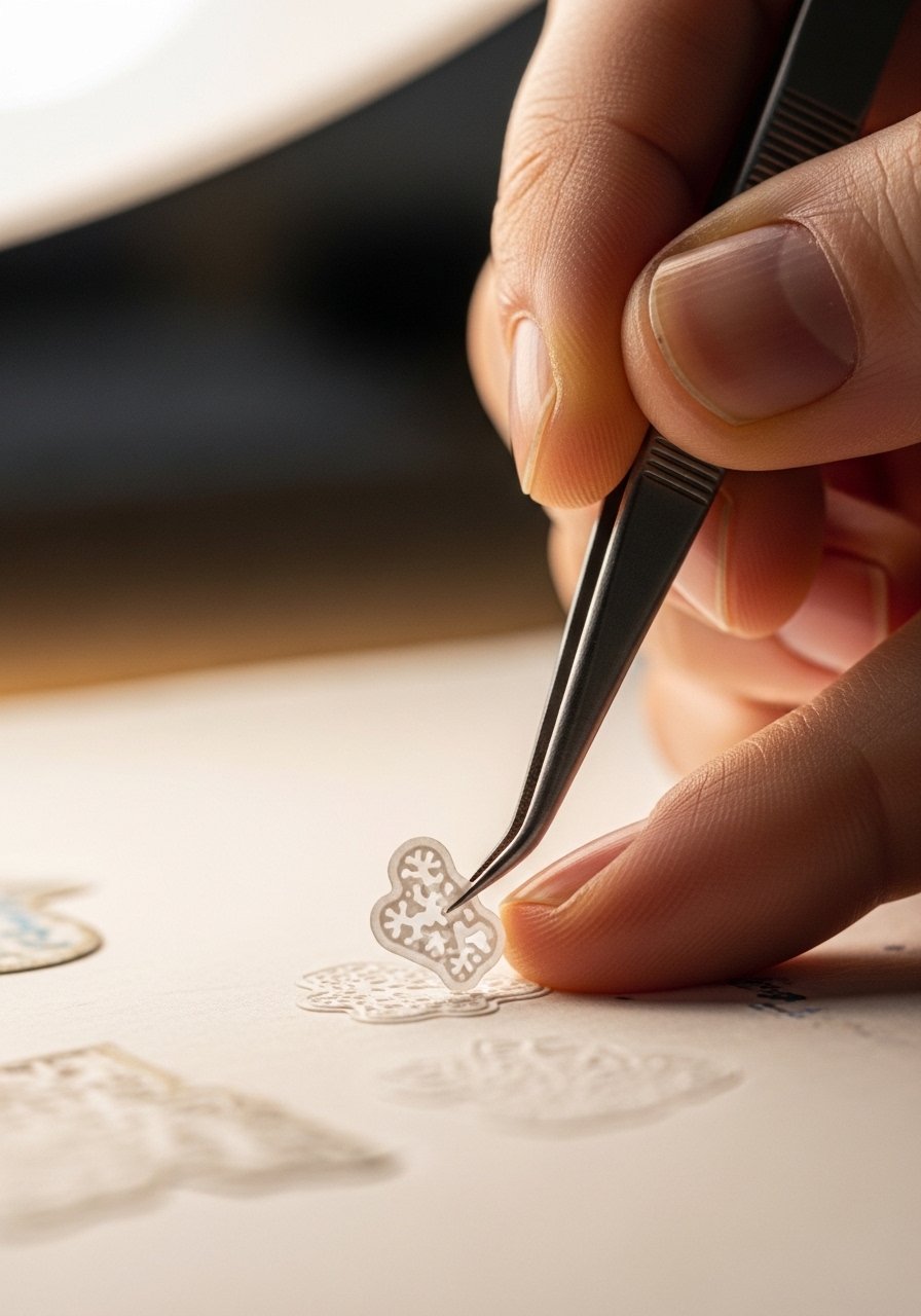 Peel-and-stick sheets are convenient. But for irregular or delicate pieces I use tweezers and a glue pen. Tweezers let me position tiny die-cuts without touching adhesive surface. For kiss-cut sticker sheets, score the backing lightly with an X-Acto blade for controlled lift.