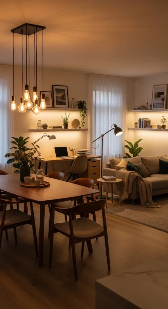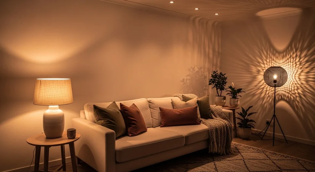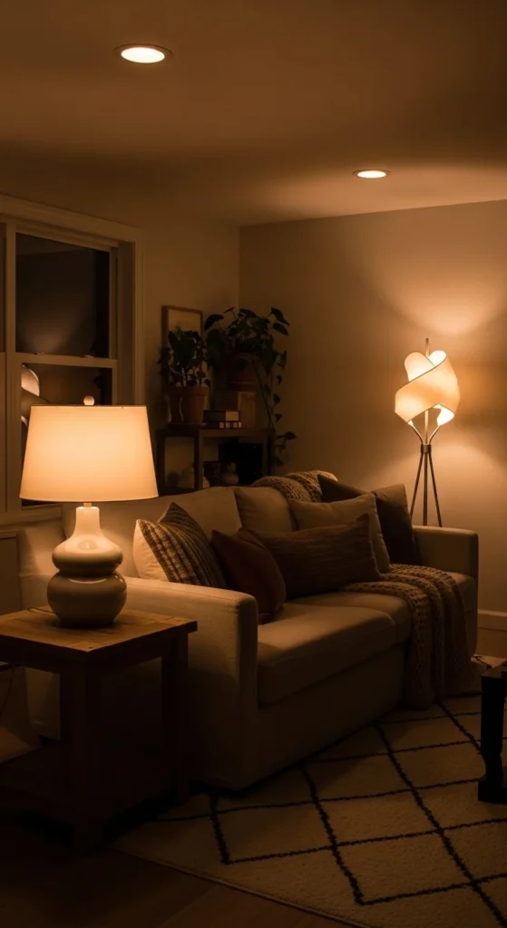 Place lamps near seating areas to create cozy “zones” and avoid relying on ceiling lights alone.
