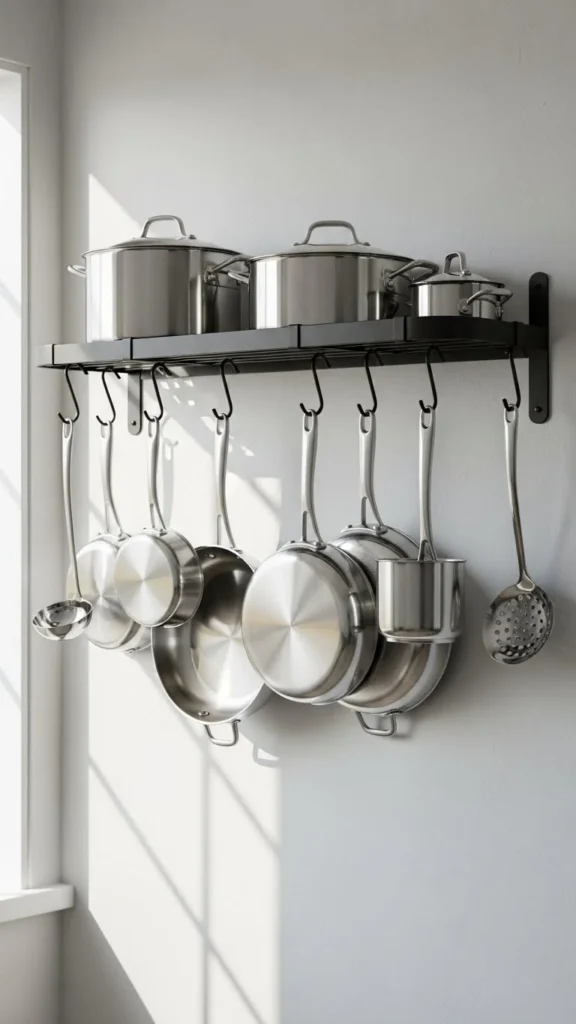 Wall-mounted pot racks free cabinet space and keep cookware accessible. Compact racks suit small kitchens. Mounting into studs provides stability. Arranging pots by size keeps things tidy. This setup clears counters while adding visual structure.
