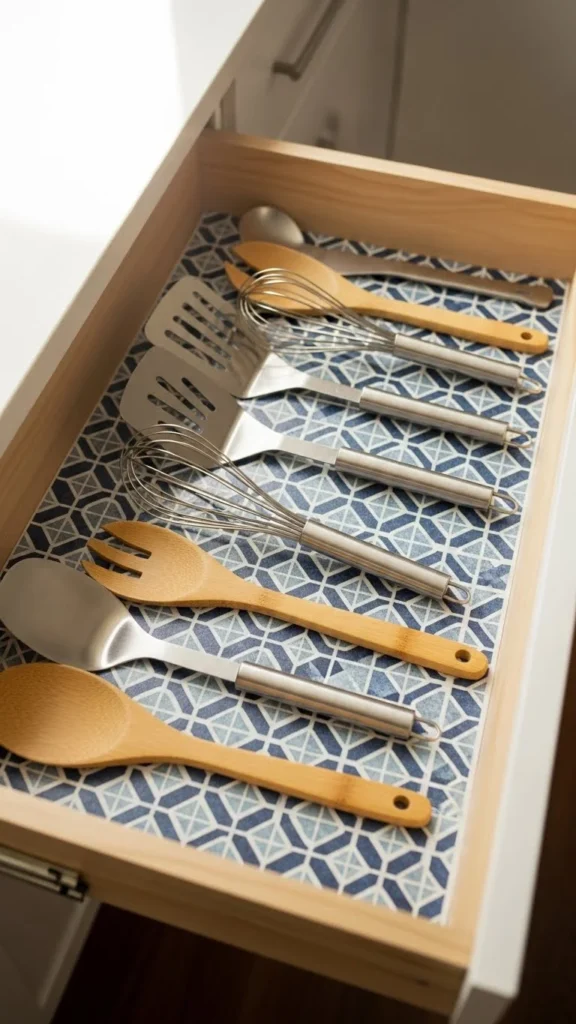 Drawer liners protect surfaces while adding subtle detail. Contact paper installs easily and removes cleanly. Soft patterns work well long term. This detail adds interest during daily use without affecting layout.