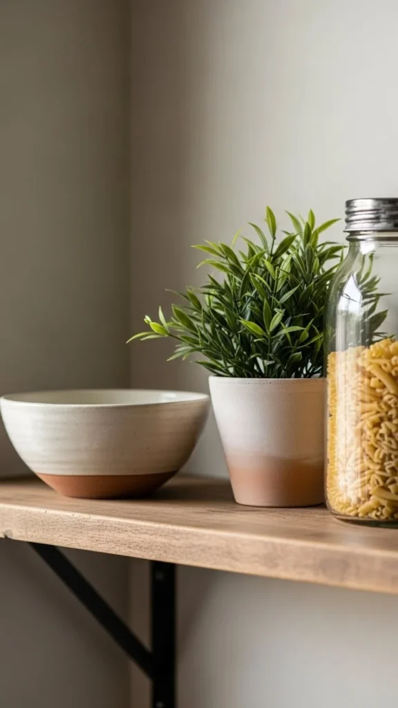 Plants soften shelves and add natural shape. Small potted herbs or trailing plants work well. Choose low-maintenance options. Faux plants also work when light is limited. Keep planters simple so greenery stands out. One or two plants per shelf is enough. Too many can feel messy. Plants pair well with ceramics and wood, adding contrast without clutter.