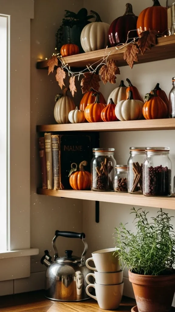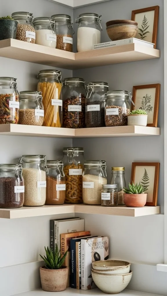 Corner shelves often become cluttered. Treat them like small displays instead. Limit items to a few coordinated pieces. Jars, plants, or bowls work well. Avoid mixing too many styles. Keeping corners simple helps the rest of the shelves feel calmer.