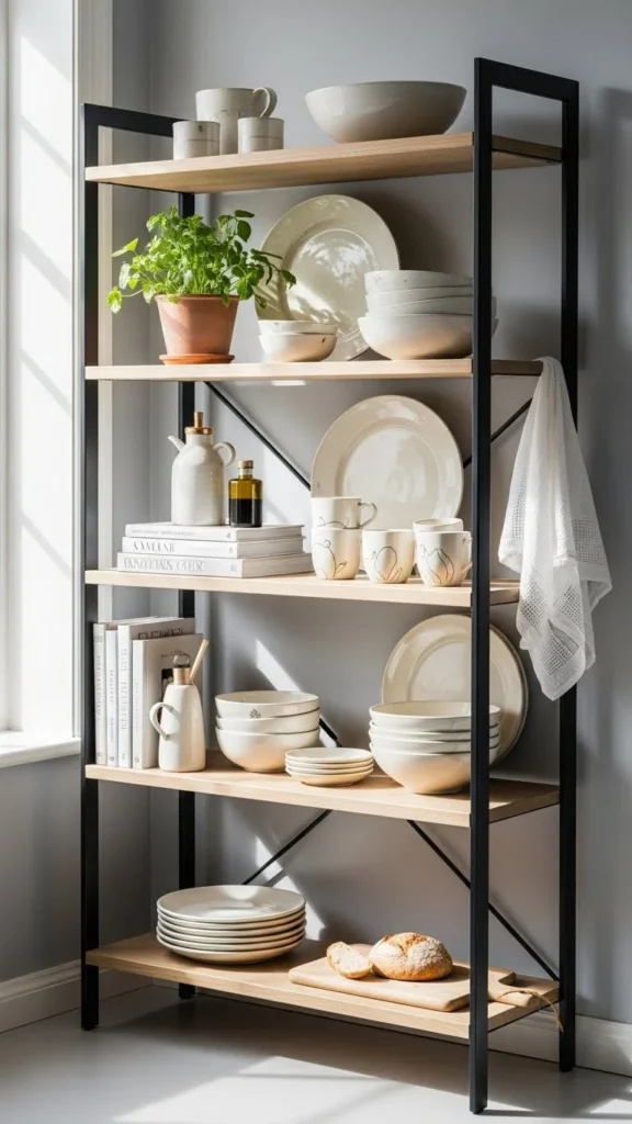 Freestanding shelves work well for rentals or changing layouts. They allow styling without wall installation. Keep displays light so the unit does not feel heavy. Baskets on lower levels hide storage. Decor and dishes stay higher. This option adds storage without commitment.