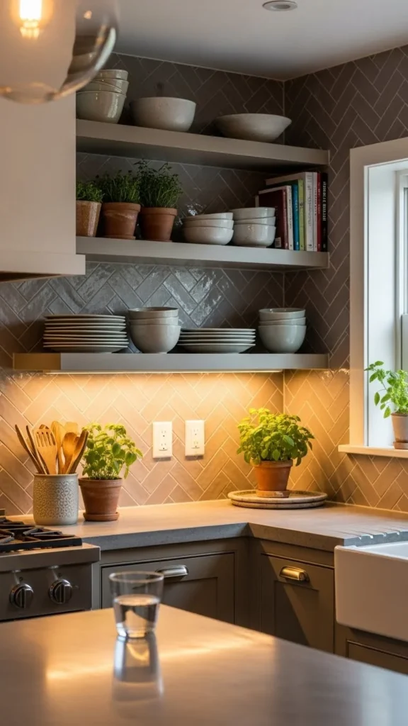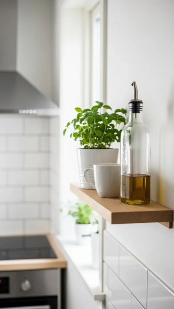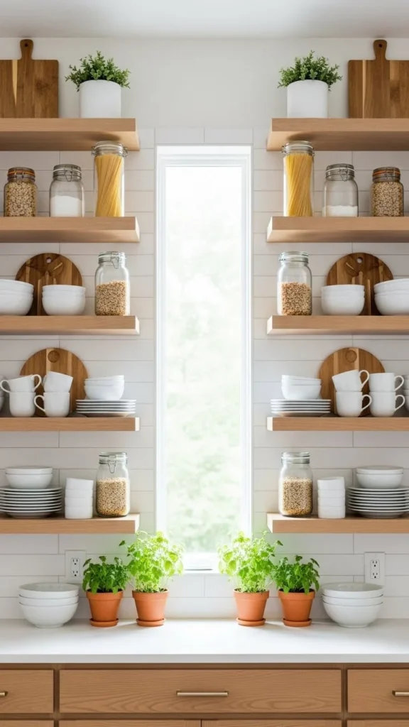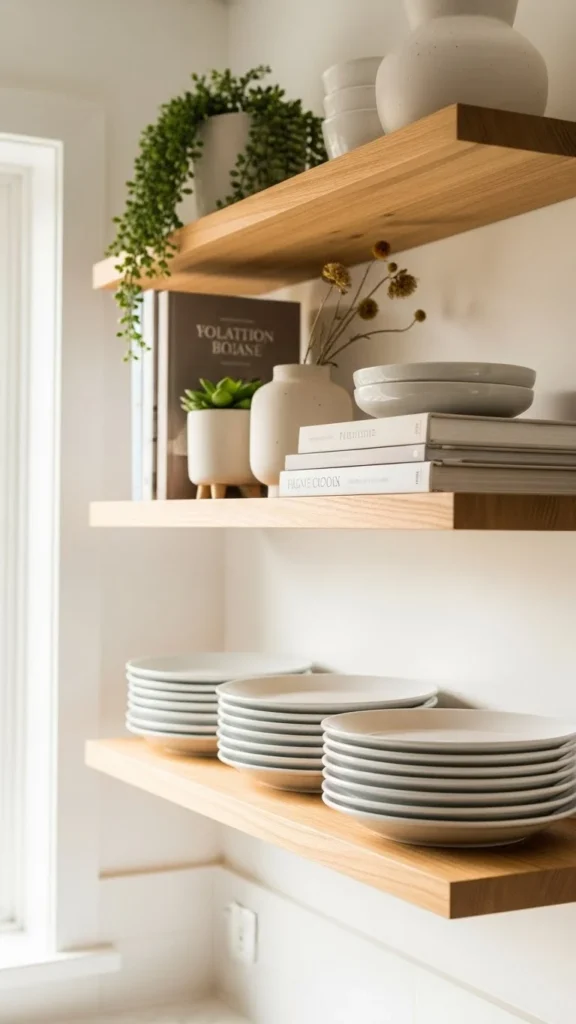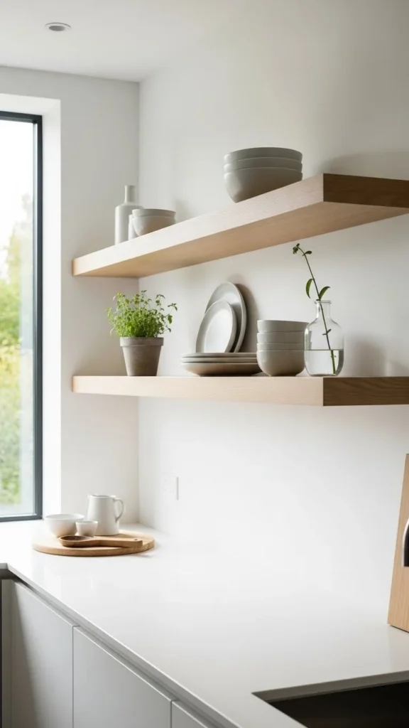Hidden brackets create a clean look. Floating shelves feel lighter visually. Keep styling minimal so shelves remain the focus. This works well in modern kitchens.