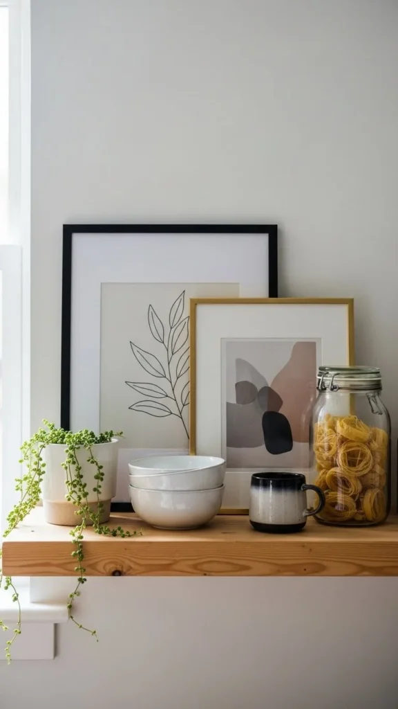Leaning art adds personality without nails. Small frames work best. Food prints or simple sketches suit kitchens well. Keep frames neutral. Layer art behind other items for depth. This approach allows easy swaps later.