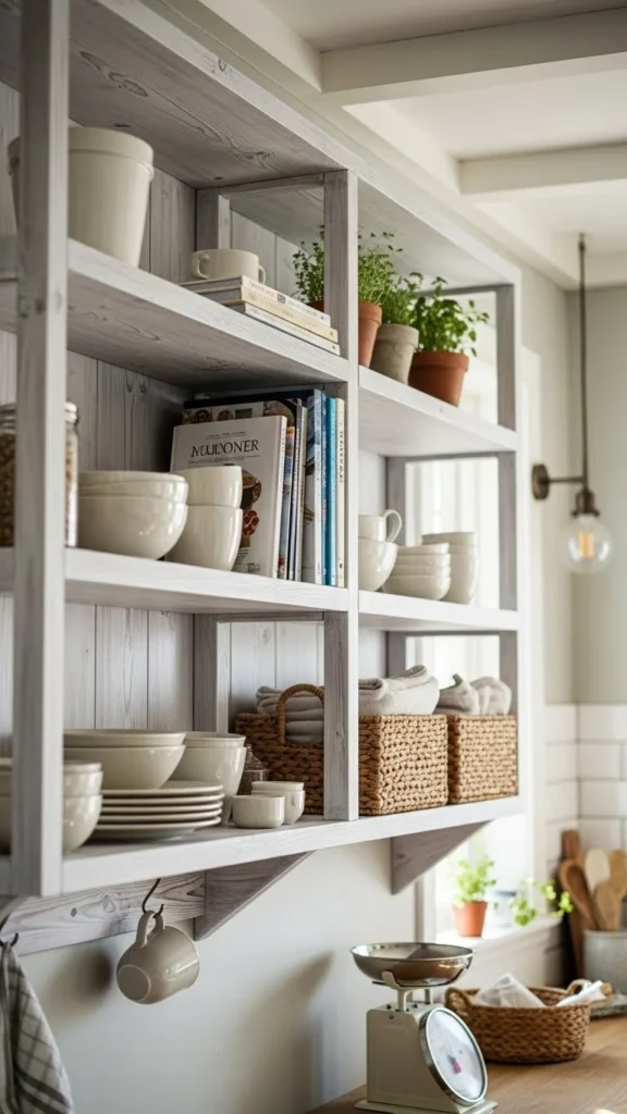Whitewashing wood shelves softens their look. This works well in farmhouse-style kitchens. Use diluted paint and wipe excess off. Test on a hidden area first. This update costs little and refreshes older shelves.