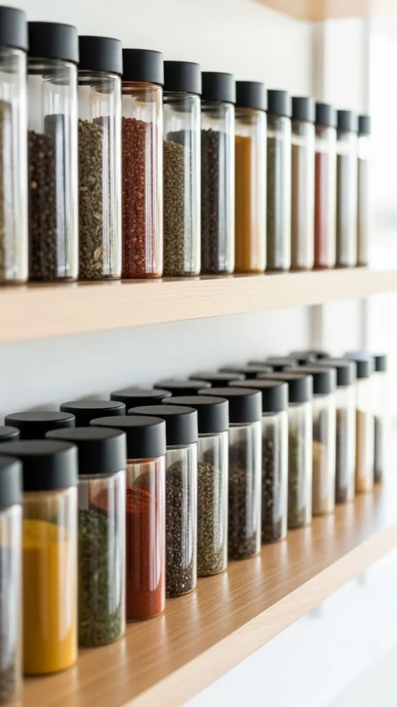 Matching spice jars bring order to shelves. Clear jars with simple lids work best. Labeling is optional. Keep jars aligned in rows for a pantry-style look. This setup improves access while staying neat.