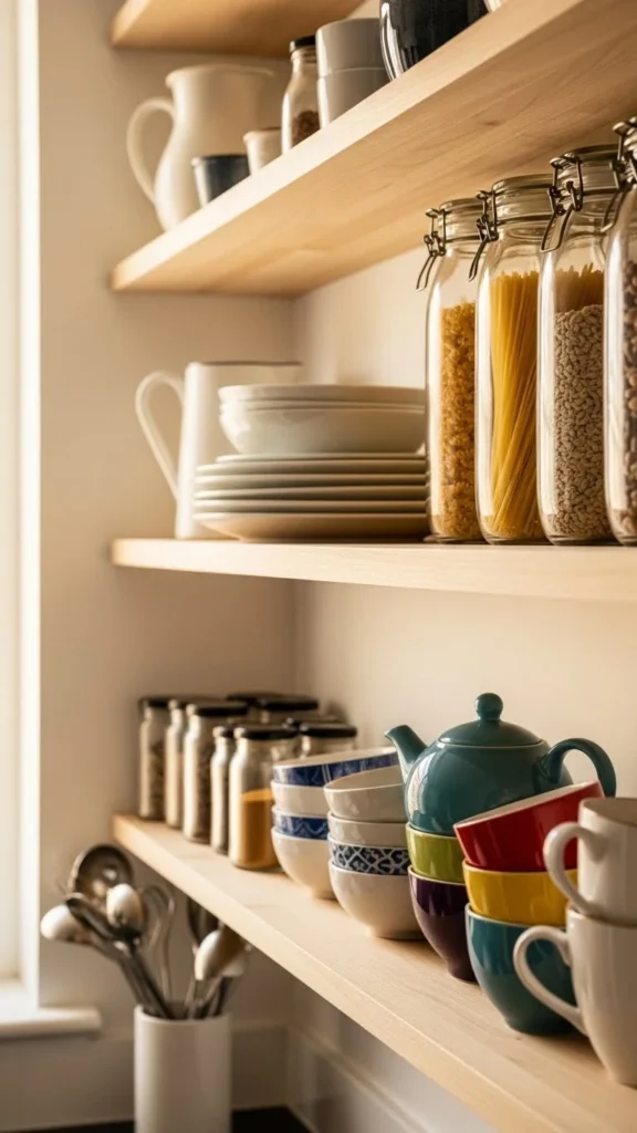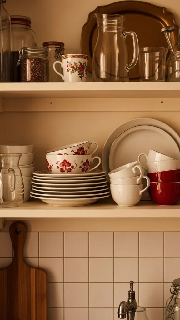 Lower shelves work best for items used daily. Plates, bowls, and glasses stay easy to reach and reduce visual chaos. Stack items neatly and keep quantities limited. Extra pieces can stay in cabinets. Upper shelves can hold decor or rarely used items. This zoning keeps shelves practical and clean. Using matching dish sets helps maintain order. Thrift stores are good places to find simple ceramics at low cost. When shelves feel busy, remove half the items and reassess. Fewer dishes displayed often look calmer and are easier to maintain.