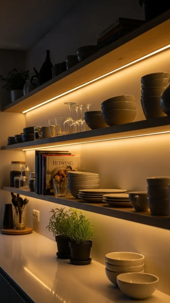 LED strips behind shelves add depth. Warm tones work best. Installation is simple with adhesive strips. Hide cords for a clean look. This adds gentle light without changing fixtures.
