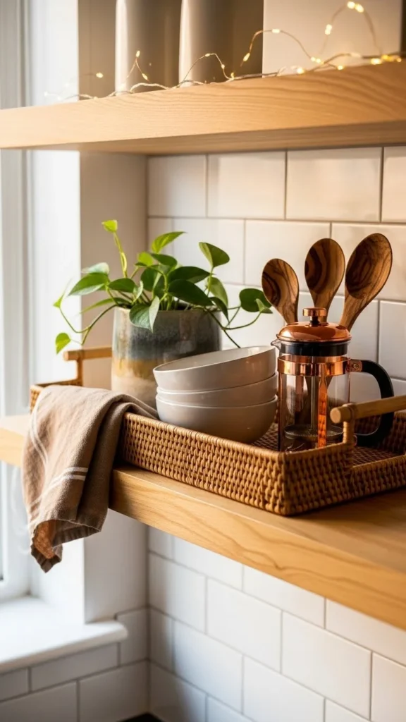Leaving empty space is key to a polished look. Shelves filled edge to edge feel busy. Aim to use only part of the available space. This gives items room to stand out. Remove extras and store them elsewhere. Negative space makes shelves easier to clean and restyle. It also helps prevent visual overload in small kitchens.