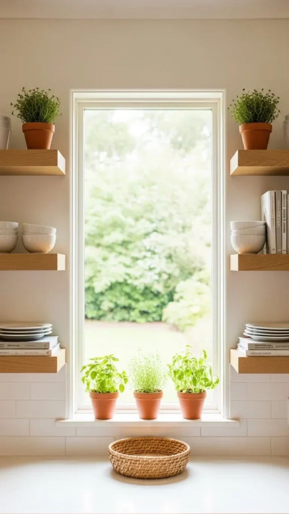 Shelves between windows benefit from repetition. Matching decor on each side creates balance. Keep colors consistent. This framing effect feels orderly and intentional.