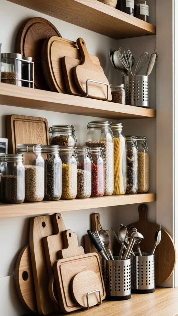 Using different materials adds depth without clutter. Wood brings warmth. Glass keeps things light. Metal adds contrast. Combining all three creates balance. Use items already in the kitchen like cutting boards, jars, or utensil holders. Keep the color palette simple so finishes do not compete. Repeat materials across shelves to create flow. Avoid placing all wood on one shelf and all glass on another. Spreading materials evenly keeps the display steady. This approach works in both modern and traditional kitchens.