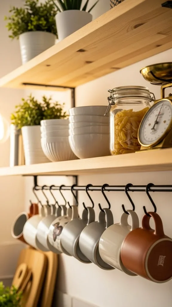 Hooks under shelves create extra storage without clutter. Mugs stay easy to grab and add shape below the shelf line. Choose simple metal hooks for a clean look. Install them evenly spaced. Keep the number limited so the area does not feel crowded. This works well for coffee corners or near breakfast areas. It also frees cabinet space. Hooks are inexpensive and easy to remove later.