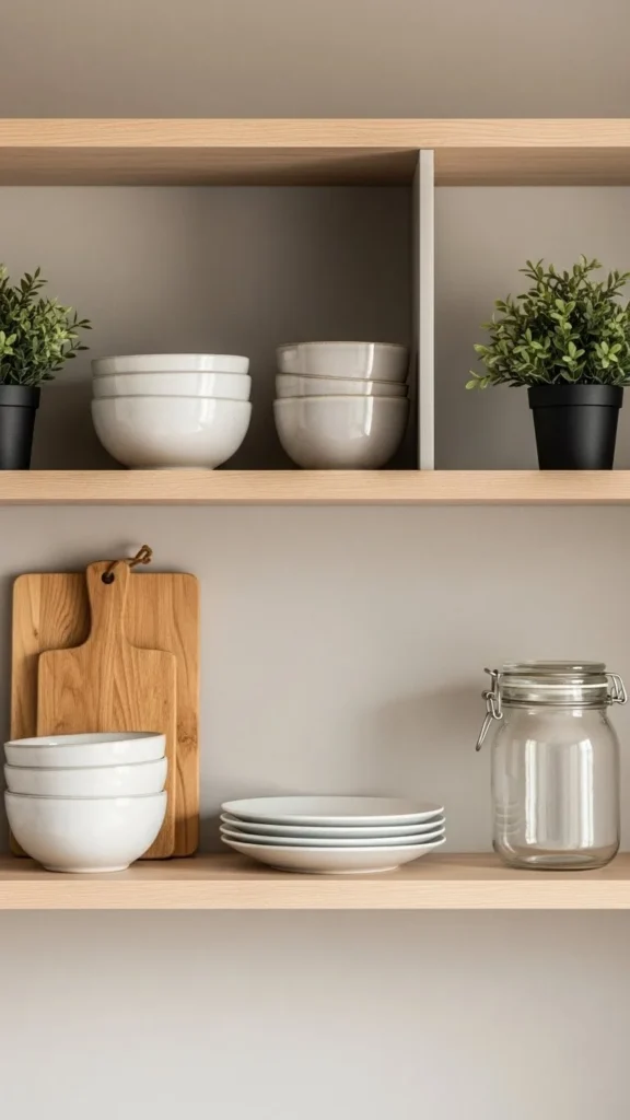 Symmetry creates order. Matching items on both sides of a shelf feel calm and balanced. This works well in formal kitchens. Use pairs of jars, bowls, or plants. Keep sizes similar. This approach reduces guesswork and keeps shelves tidy.