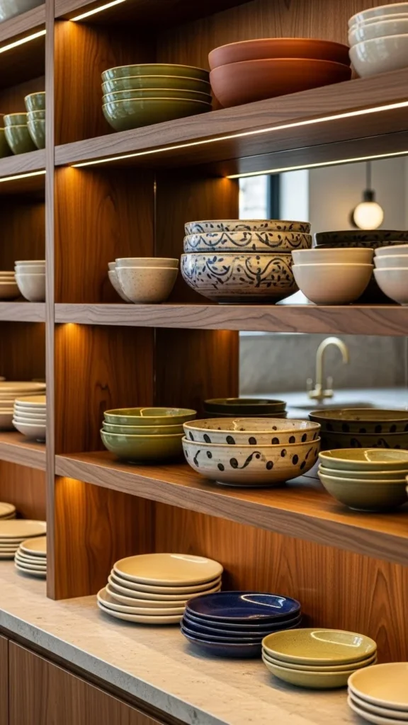 Ceramic bowls and plates ground shelf displays. Their weight and texture create focus. Use them as anchor pieces at the ends or center of shelves. Neutral colors work best. Stacking plates vertically or leaning them against the wall adds interest. These items often come from existing dish sets, keeping costs low.