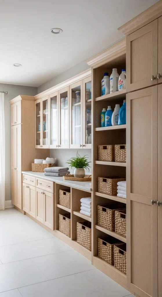 Floor-to-ceiling cabinets make use of vertical space that often goes unused. Instead of spreading storage across multiple small shelves, one tall unit can hold everything in a single zone. Upper shelves are great for bulk paper goods, seasonal items, or backup supplies. Lower shelves can store everyday detergents and cleaning tools. Closed cabinet doors help reduce visual clutter, making the room look calmer and more organized. Adjustable shelving allows flexibility as your storage needs change. Even narrow cabinet designs can fit beside appliances or in tight corners. This approach keeps items off the floor and out of sight, instantly improving the overall feel of the room.